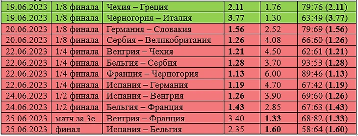 В 1/8 еще были неожиданные результаты, а дальше во всех матчах фавориты забрали своё, причем без особых шансов. Только у Чехии был хороший шанс в 1/4 обыграть венгерок, но немного не повезло. Бельгийки сверх уверенно прошли весь турнир и заслуженно победили. Несмотря на 10 подряд побед фаворитов, при фиксированной ставке в 2% на андердогов чистая прибыль за весь турнир составила бы 13.9%. При ставке в 500 рублей: +3475 рублей.