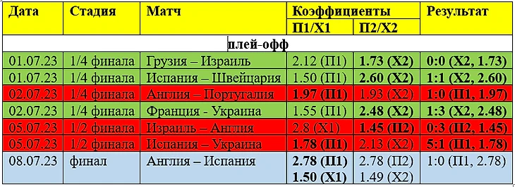 Так как турнир короткий, в плей-офф было сыграно немного матчей. Четвертьфиналы выдались достаточно неожиданными, особенно победа сборной Украины над Францией (Х1 2.48) и ничья в основное время сборной Швейцарии в матче с испанцами (Х1 2.60).