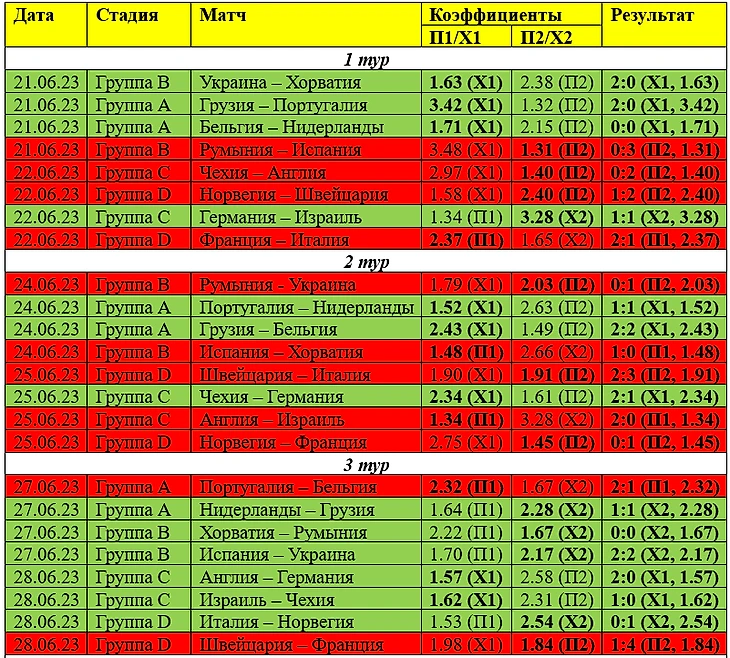 Самые большие коэффициенты, которые зашли на групповом этапе: 3.42 (Х1 на Грузию в матче против Португалии (2:0)); 3.28 (Х2 на матч Германия - Израиль (1:1)) и 2.54 (Х2 в матче Италия - Норвегия (0:1)).