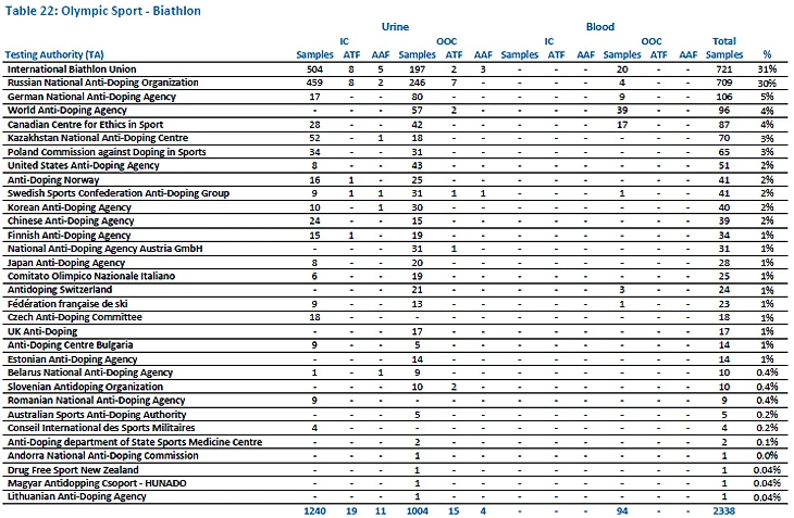 Итак, по линии РУСАДА у биатлонистов было взято в 2013 году (за 2014 год данных еще нет) 709 допинг-проб, по линии IBU – 721 проба, немецким агентством – 106. Большое количестов тестов у российской лаборатории связано а) с большим числом биатлонистов в России б) с обещанием наших чиновников решить допинговые проблемы.