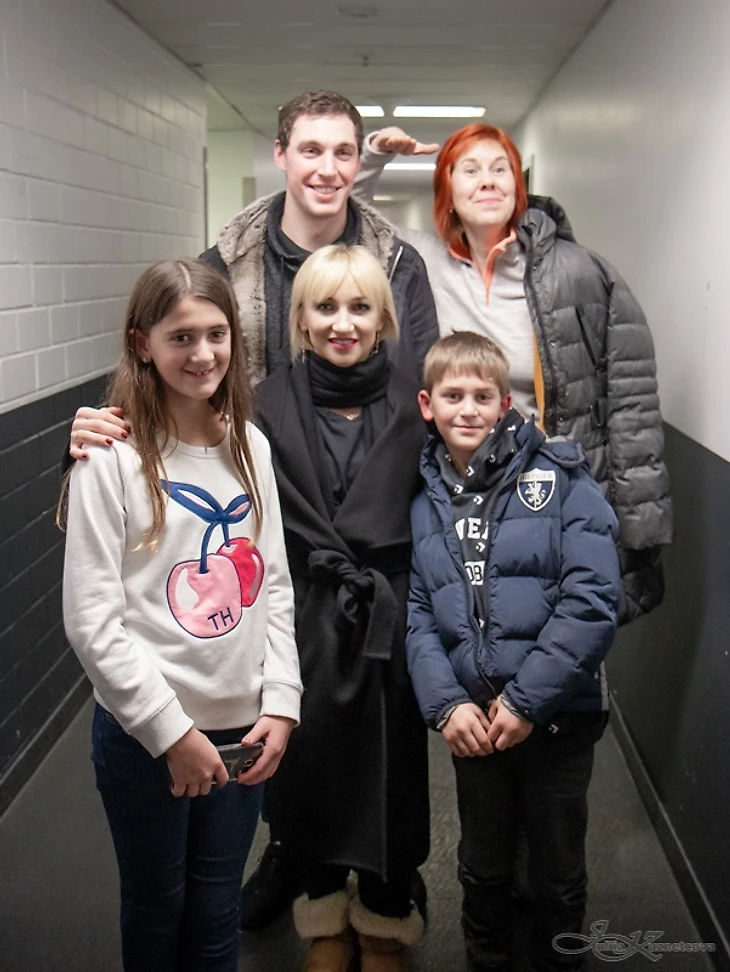Вообще-то я, как правило, не фотографируюсь с фигуристами. Да и тут не собиралась. Здесь с чемпионами фотографировали детей. Но фотографировал Алексей Рогонов, который, к моему удивлению, оказался ниже меня ростом. И мне почему-то именно в этот момент взбрело в голову подойти к Бруно и выяснить, кто же из нас выше. Выше, как ни странно, оказался он. А на фото для истории остался момент, когда я показываю Алексею, какого он роста :-)
