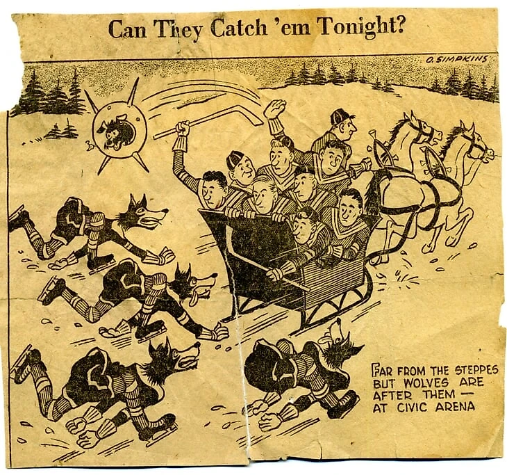 Шарж на советских хоккеистов из канадской газеты 1957 года, опубликованный перед матчем с командой «Садбери Вулвз». Sputnik, Laika, двойка удалая