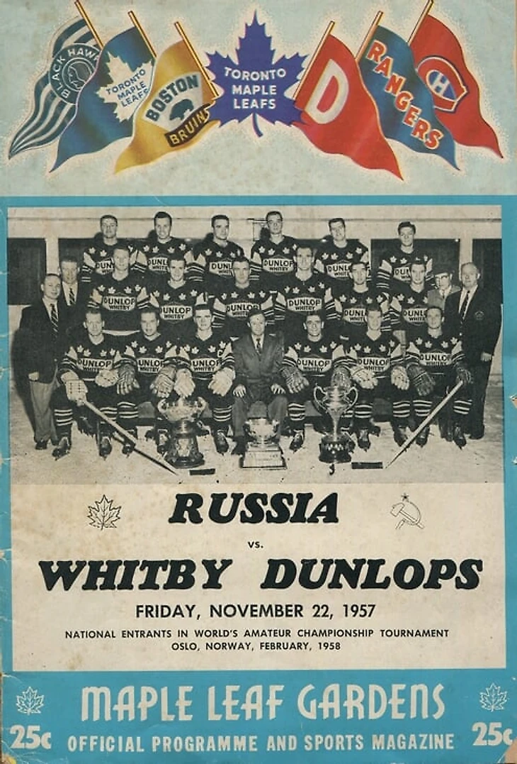 22 ноября 1957 года сборная СССР впервые играла против канадцев в Канаде, и сразу в «Мэйпл Лиф Гарденс». Ее соперником был действующий обладатель Кубка Аллана «Уитби Данлопс» (Whitby Dunlops), молодой полупрофессиональный клуб из Онтарио, созданный при фабрике, производящей теннисные мячи. «Никогда еще за всю столетнюю историю хоккея коньки чужеземных хоккеистов не бороздили канадского льда», – патетически воскликнул руководитель советской делегации, председатель президиума Всесоюзной секции хоккея с шайбой (то есть президент федерации по-нашему) Павел Коротков.