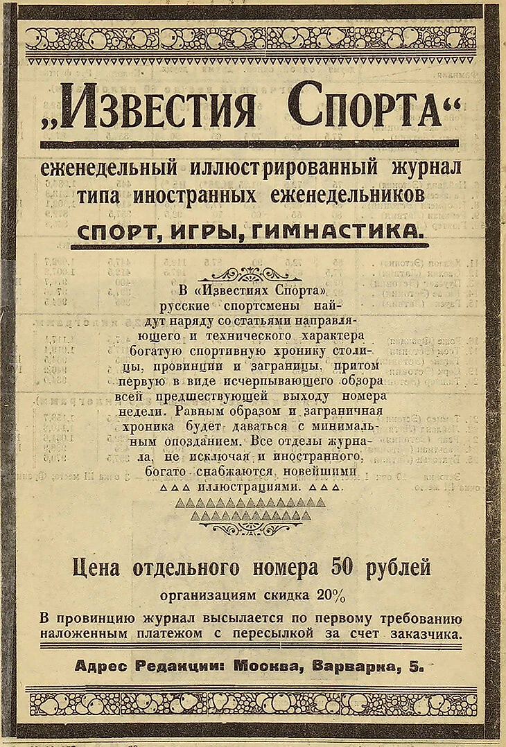 Но это тема для отдельного серьезного и обстоятельного разговора – как система дореволюционной спортивной печати преобразовывалось в кардинально отличавшуюся от нее по принципам работы, функциям и задачам советской физкультурно-спортивную периодику, какие черты оставила ей в наследство и когда, наконец, закончилась. Слишком непрост вопрос генетического родства и преемственности.