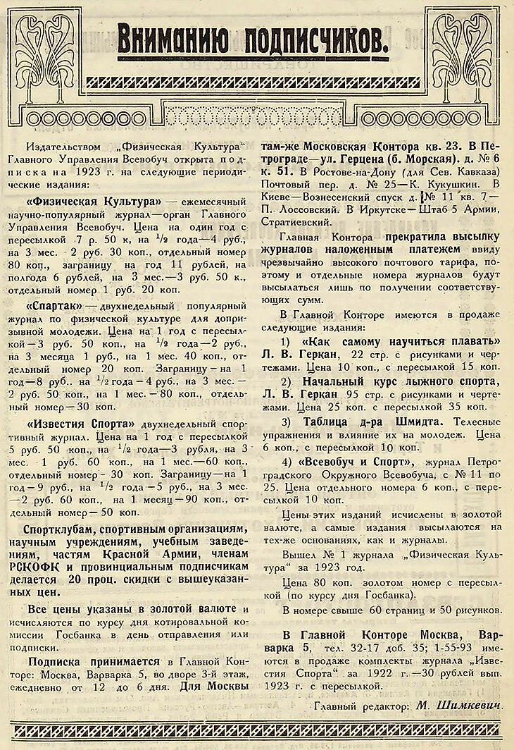 Шимкевич хотел, начав с легкого и популярного журнала (построенного по образу успешных дореволюционных проектов), постепенно меняя его содержание в сторону большей классовой и политической выдержанности, продолжая оставаться при этом привлекательным изданием, «перевоспитать» аполитичных спортсменов, привлечь их на свою сторону, сохранить и преумножить аудиторию. Один из примеров отличного знания читательской психологии и понимания реалий того рынка спортивной периодики – то, чего будет не хватать многим другим создателям спортивной печати в этот период.