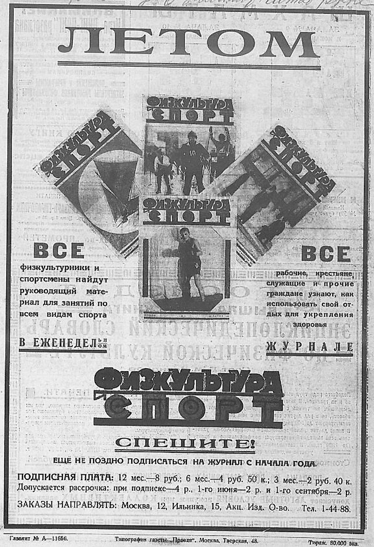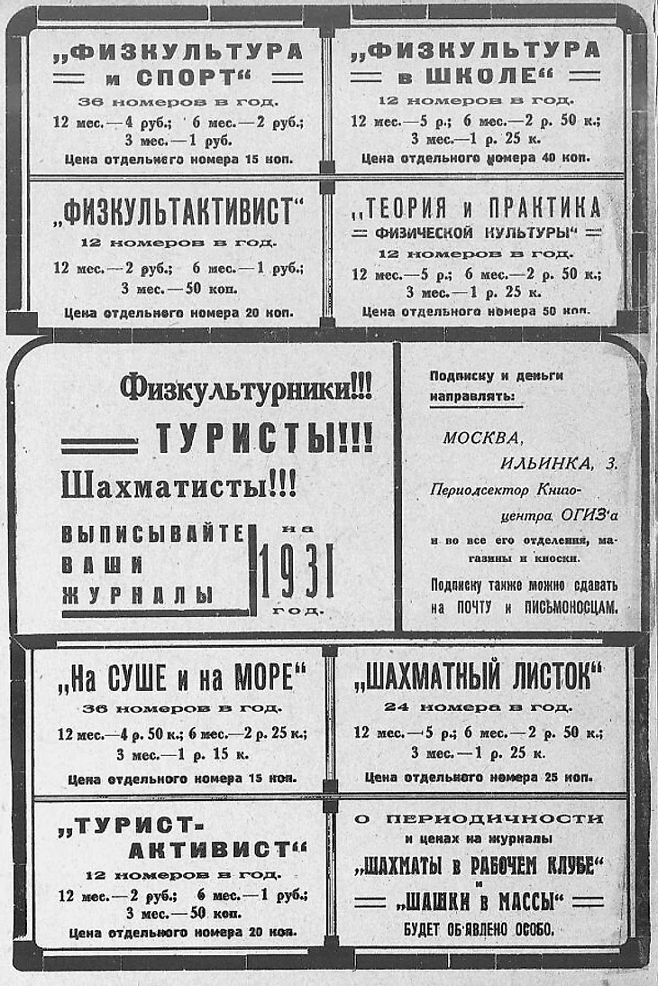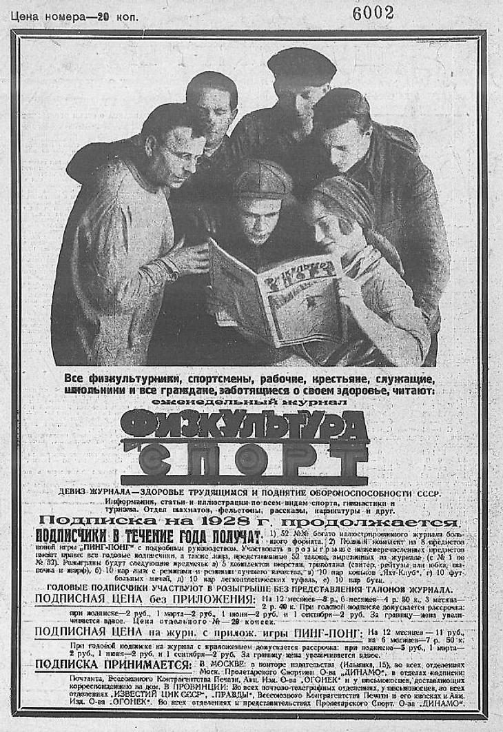 Это проявилось уже в самом начале, когда выходу журнала «Физкультура и спорт» сопутствовала широкая подписная кампания с объявлениями во всех почтово-телеграфных отделениях, при поддержке «Известий», «Правды», Всесоюзного контрагентства печати и того самого издательства «Огонек».