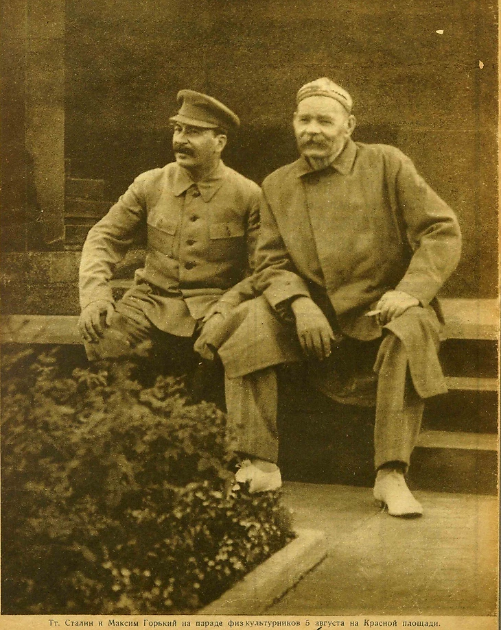 Вот, например, известное фото, на котором Сталин и Горький о чем-то беседуют, сидя на ступеньках в сквере на Красной площади в день парада физкультурников.