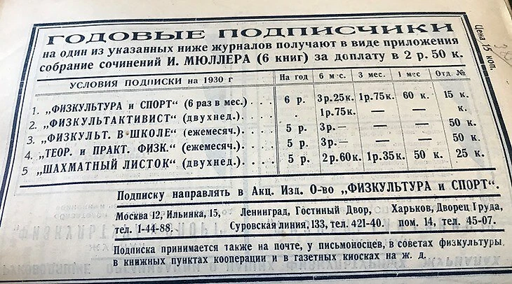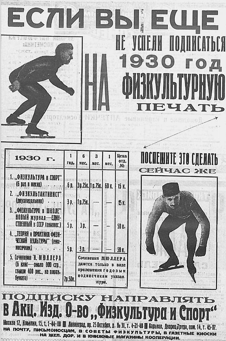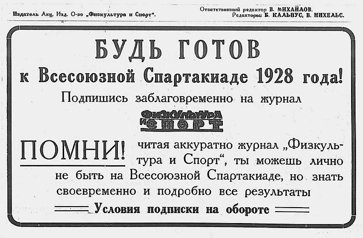 В общем, коммерческий подход Михельса, построенный на активном использовании рекламы, широкой подписке и цветущем разнообразии методов привлечения читателей, оправдал себя. К 1930 году журнал «Физкультура и спорт» достиг тиража 60 тысяч экземпляров – казалось бы, немного на фоне «миллионной армии физкультурников», как заявлял ВСФК, – но ни одно спортивное издание в нашей стране прежде не показывало таких цифр.