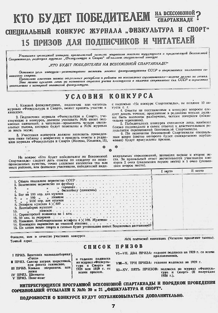 Для подписчиков журнал «Физкультура и спорт» организовал конкурс прогнозов «Кто будет победителем на всесоюзной Спартакиаде?» с ценными призами – от годовой подписки до малокалиберной винтовки. В дальнейшем подобные конкурсы – например, «Кто выиграет всесоюзное первенство по футболу?», «Кто выиграет всесоюзное первенство по городкам?» – стали регулярными.