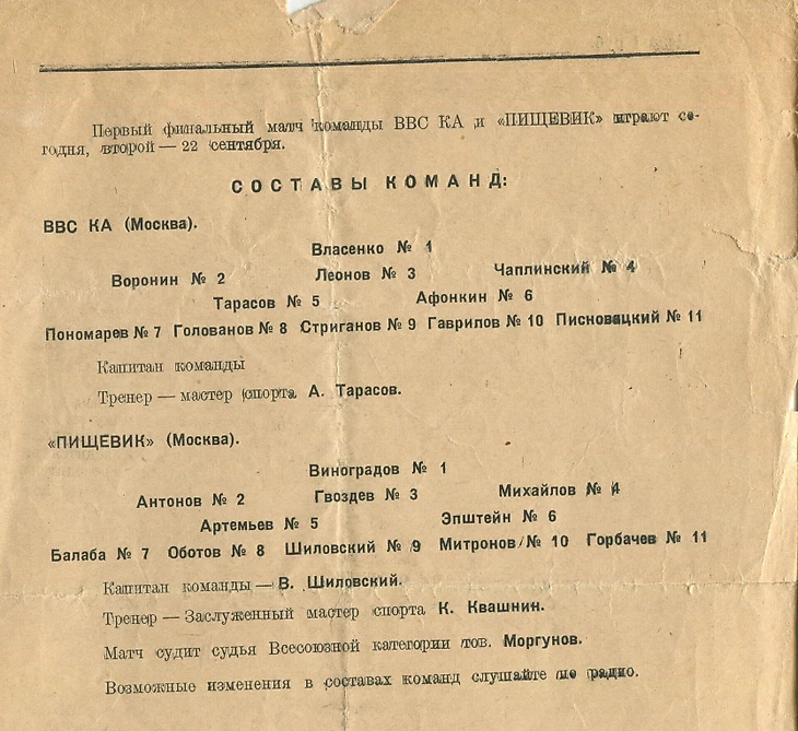 Можно предположить, что старший лейтенант Анатолий Тарасов обратился не напрямую к маршалу, а к своему непосредственному футбольному начальнику – председателю секции футбола во Всесоюзном спорткомитете Сергею Александровичу Савину (в 1951–1954 гг. – вице-президент ФИФА). По цепочке: защитник команды ВВС Андрей Чаплинский доложил о взятке своему старшему тренеру, тренер – руководителю секции, а тот – своему непосредственному начальнику, председателю спорткомитета Романову.