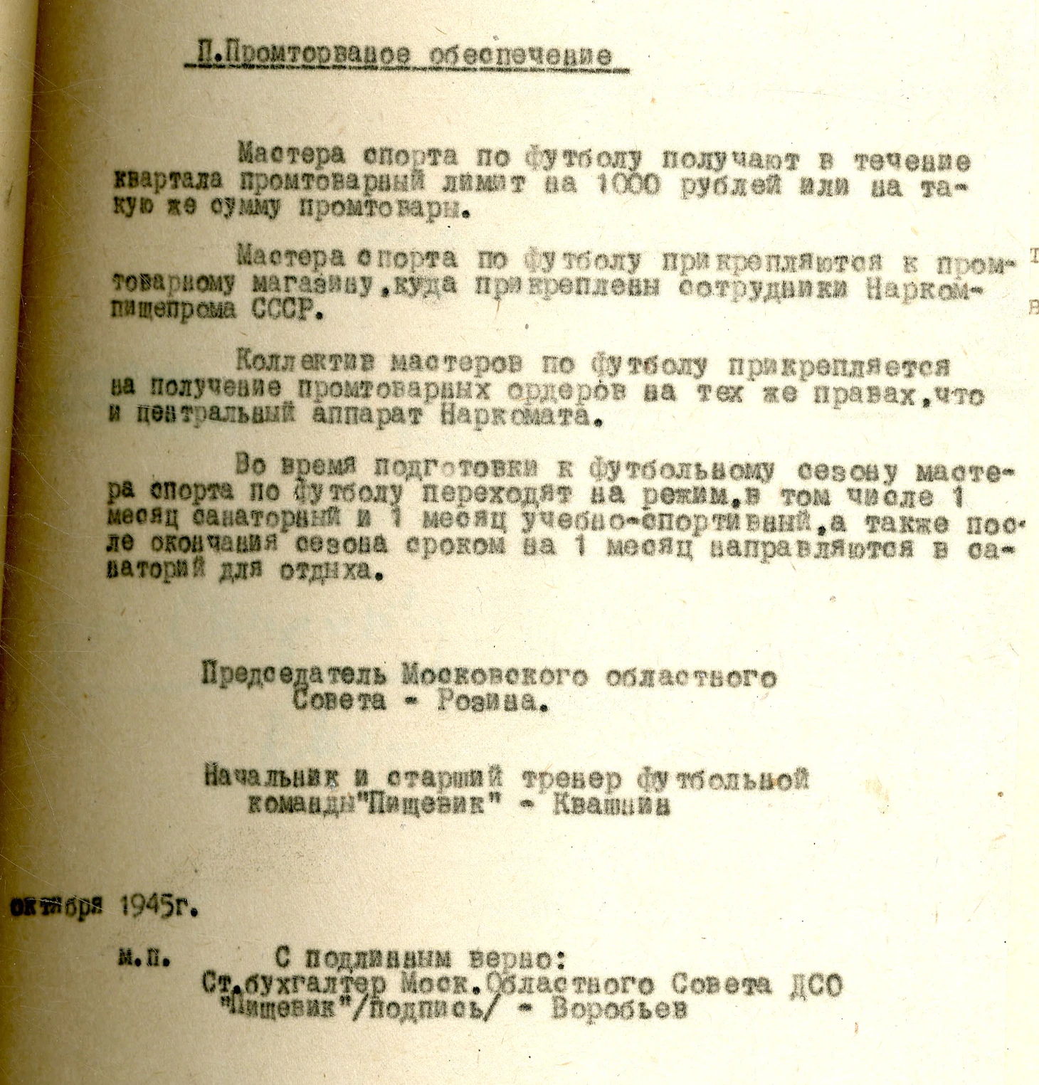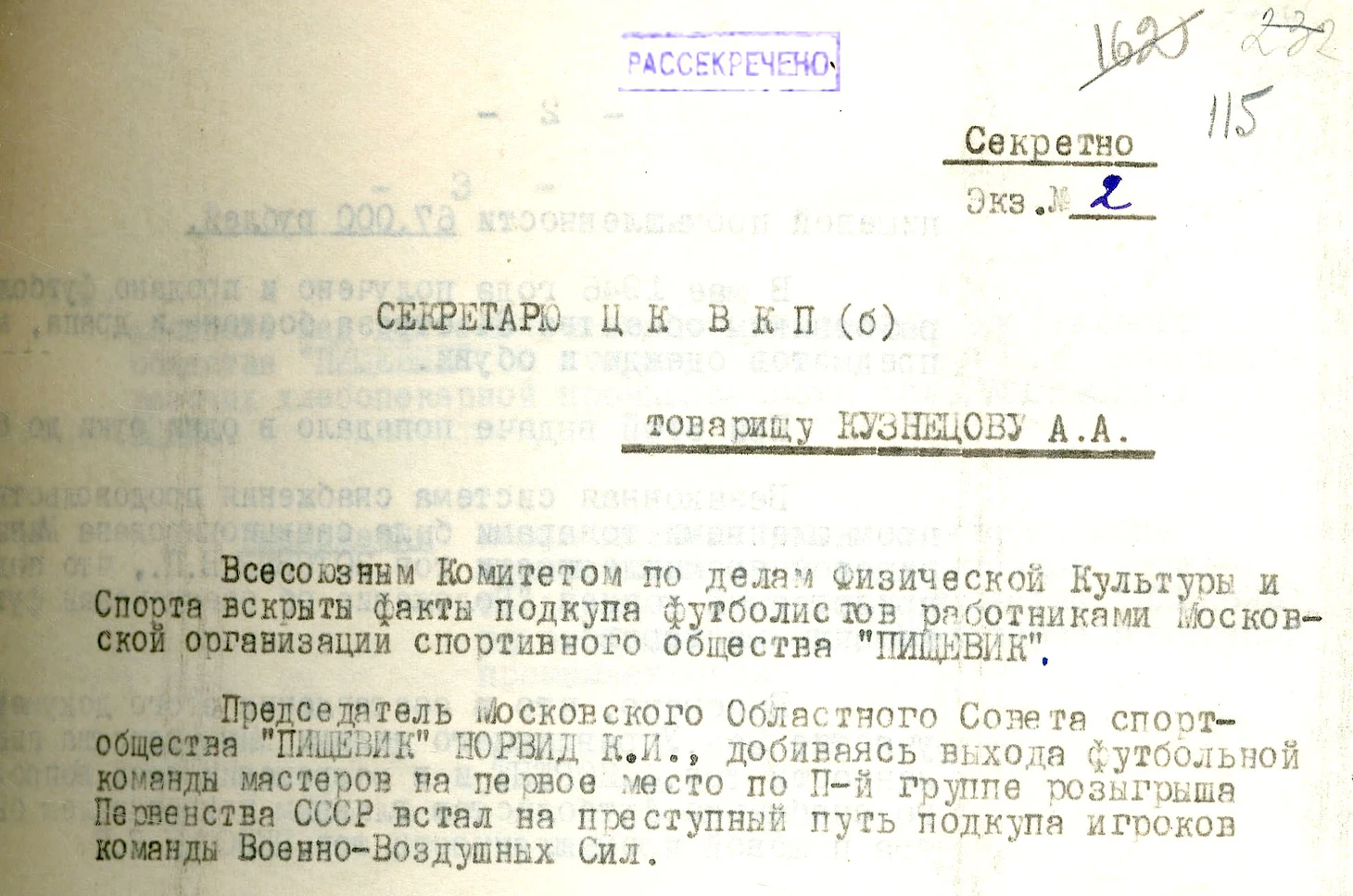 «Всесоюзным Комитетом по делам Физической Культуры и Спорта вскрыты факты подкупа футболистов работниками Московской организации спортивного общества «ПИЩЕВИК».