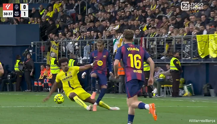 «Вильярреал» начал активнее – особенно старался форвард Айосе Перес. Но на 12-й минуте «Барса» повела благодаря пенальти: Рафинья сместился в центр и врезался коленом в опорника Санти Комесанью. Сам и реализовал. Вопросов мало: игрок «Вильярреала» выставил бедро – подставил команду.