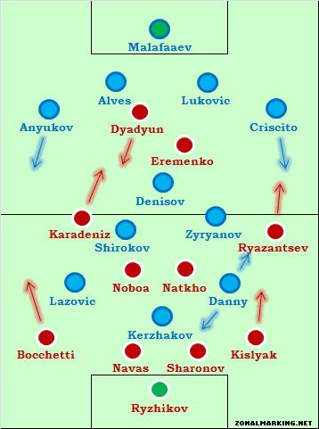 Как всегда в «Зените», действия их полузащиты были некоторой загадкой - все три центральных полузащитника имели право подключаться к атакам, что заставало полузащиту «Рубина» врасплох, и особенно атакующего центрального полузащитника Романа Еременко, который действовал только на узком участке поля. Это означало, что Игорь Денисов может подключаться вперед без опаски, как правило, оставляя Константина Зырянова страховать его.