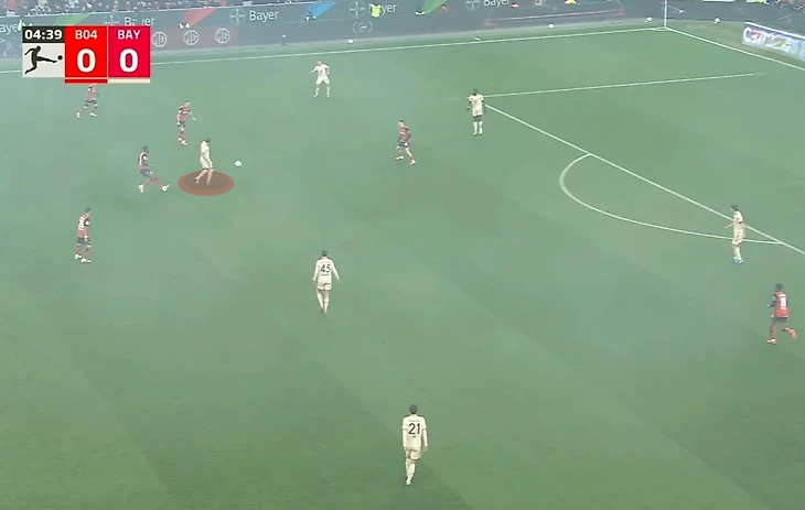 Когда у «Баварии» получалось завладеть мячом, «Байер» располагался по схеме 5-4-1. Она достигалась путем смещения Фримпонга ниже, на фланг обороны. Мукиеле, Та и Тапсоба образовывали тройку, а на левый фланг под Олисе уходил Инкапье.