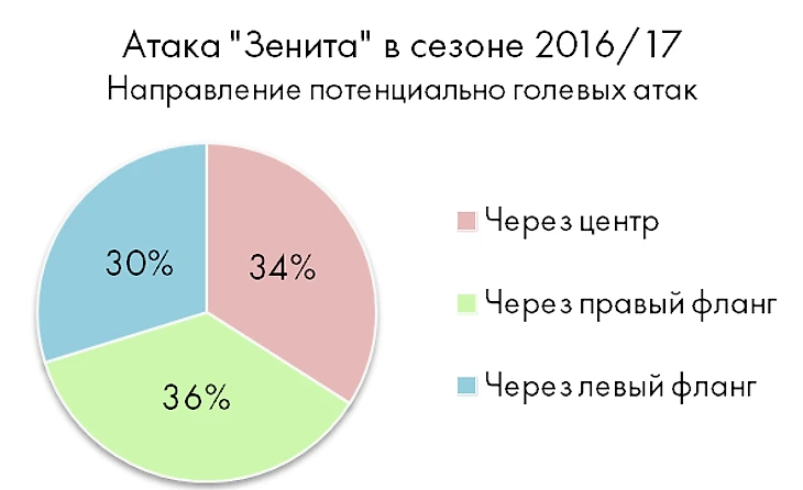 Интересно, что по сравнению с прошлым сезоном, когда около половины всех потенциально опасных атак «Зенит» провел через центральную зону (45%), распределение голевых моментов по каждому из направлений заметно изменилось, и в сезоне нынешнем оно практически равномерное.