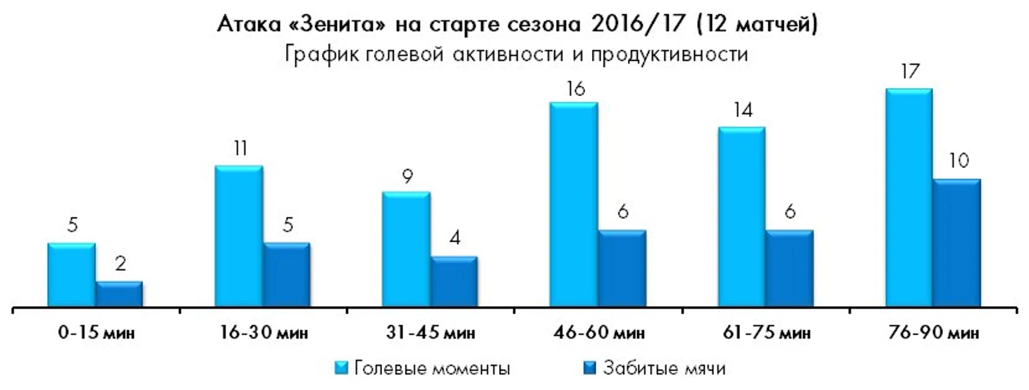 В отличие от прошлого сезона, когда пики активности «Спартака» приходились на стартовые отрезки каждого из таймов, в сезоне нынешнем распределение голевых возможностей по ходу матча отличается равномерностью.