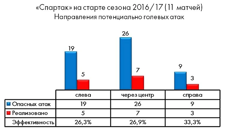 Как и в прошлом сезоне, ключевыми направлениями развития спартаковских атак являются центральная зона и левый фланг, где активничает Комбаров (текущий показатель активности - 1,5 голевых момента за матч) и куда постоянно смещается Промес. Некоторое оживление произошло и на противоположном краю атаки, но свежеприобретенные Ещенко и Зобнин пока еще не настолько сыгрались, чтобы полностью избавить «Спартак» от хронической кособокости его наступательных действий.