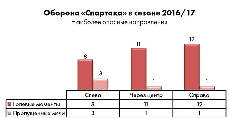 Характер потенциальных угроз воротам «Спартака» в этом сезоне распределяется следующим образом: