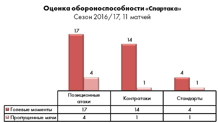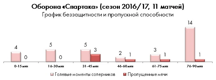 Как показывают цифры, серьезнейшие проблемы в обороне у «Спартака» возникают в последнюю четверть часа, когда количество угроз его воротам чуть ли не кратно возрастает. Та же «Уфа» имела три стопроцентных момента в последней 10-минутке, и при определенных раскладах первое поражение лидера чемпионата могло получиться разгромным.