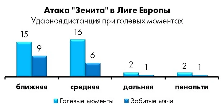 Залогом этой эффективности, с одной стороны, стало высокое качество голевых шансов – 9 из 17 мячей были забиты с ближней дистанции (0-6 метров от линии ворот).