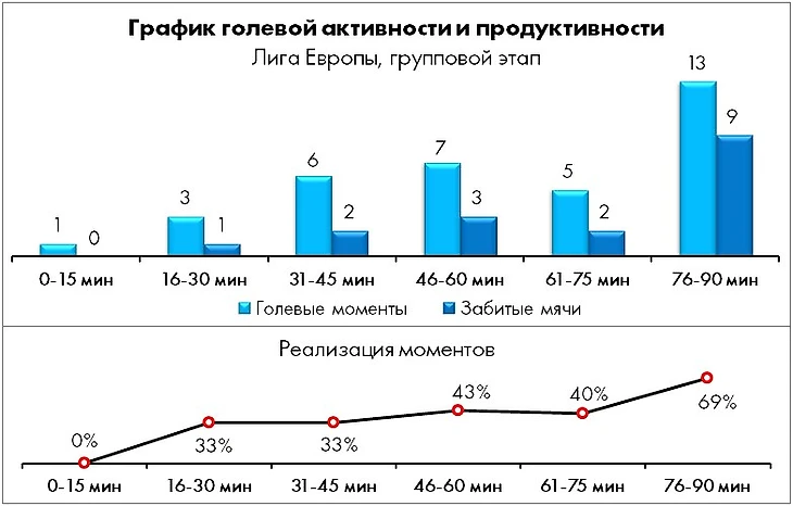 Еще одной характерной особенностью нынешней зенитовской еврокампании являются ударные эндшпили - треть голевых моментов (13 из 35) и более половины голов (9 из 17) были забиты аккурат после 75 минуты.