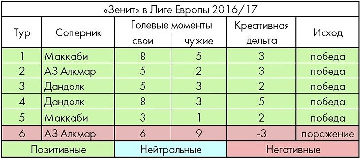 Осеннюю часть еврокубковой кампании «Зенит», как и положено очевидному фавориту группы, провел достаточно уверенно, мощно и результативно, хотя и без приключений вроде сумасшедшего победного камбэка в Израиле обойтись не удалось. Во всех матчах, за исключением последнего, команда Луческу имела выраженное преимущество над соперником по количеству созданных голевых моментов, и все пять «позитивных» поединков закончила в свою пользу.