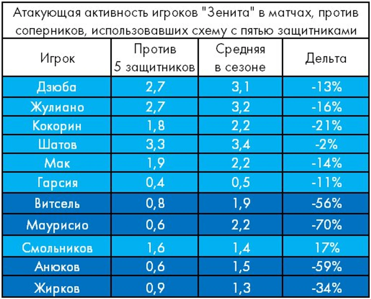 Разумеется, описанные тренды напрямую отражаются и на персональной статистике, так что и здесь можно отметить ряд интересных особенностей. Учитывая, что созидательная активность «Зенита» в искомых матчах ниже среднесезонного уровня примерно на 15% (4,6 против 5,3 голевых момента), аналогичную негативную дельту в персональной активности можно считать условно нормальной.
