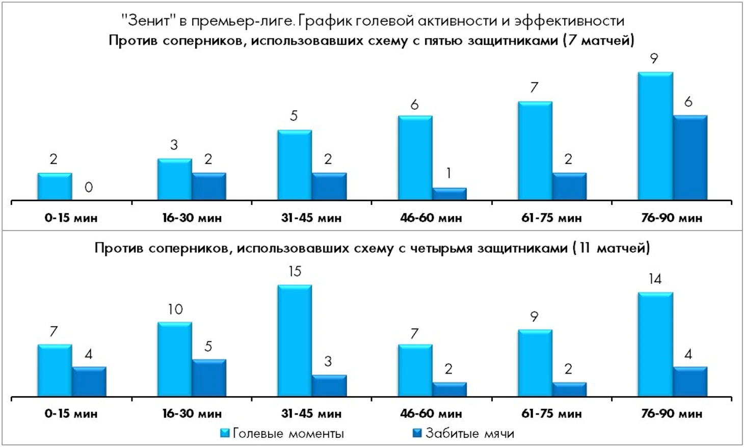 4. Обращает на себя внимание сравнительно низкое качество голевых моментов в матчах с командами, которые играли против «Зенита» в пять защитников.