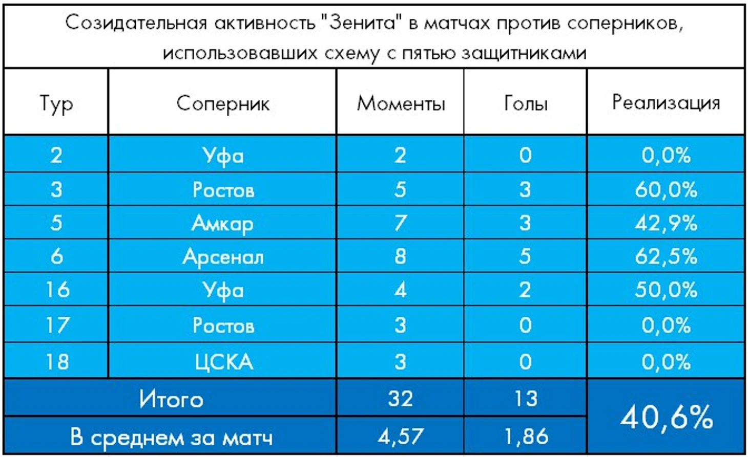 Вроде бы неплохой средний показатель результативности (1,86 против 2,12 в остальных матчах сезона) не должен вводить в заблуждение: фактически только в двух поединках из семи (с «Амкаром» и «Арсеналом») у «Зенита» не возникло проблем с преодолением насыщенной обороны противника. При этом в трех из пяти оставшихся матчей зенитовцы не сумели забить, создавая в среднем лишь 3,4 голевых ситуации – в полтора раза меньше своего обычного уровня в текущем сезоне (5,3).