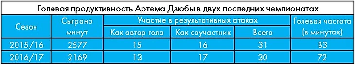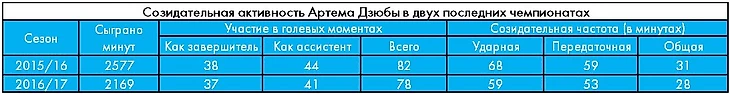 Несмотря на заметное снижение командных атакующих показателей по отношению с прошлым сезоном (созидательной активности – с 6,20 до 5,53 голевых моментов, результативности – с 2,03 до 1,67 голов в среднем за матч), полезная активность Артёма – как ударная, так и передаточная – даже немного подросла.
