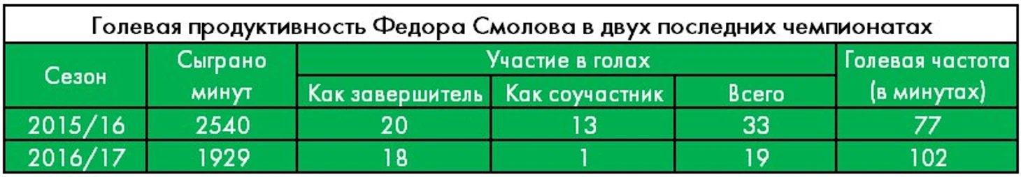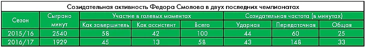 В прошлом сезоне, значительную часть которого Смолов отыграл на фланге, он не только забивал сам, но и принимал деятельное участие в организации атак на более ранних стадиях. По итогам чемпионата 2015/16 он набрал ровно 100 баллов за полезную активность при создании голевых возможностей (больше было только у Халка – 110), причем в 40% случаев выступал в качестве ассистента.
