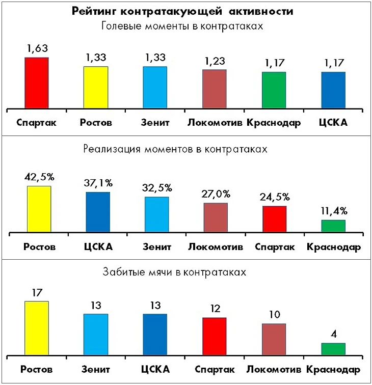 Ещё печальнее ситуация у «Краснодара», который за весь чемпионат в контратаках забил только 4 мяча (в прошлом году при Кононове было 17!).