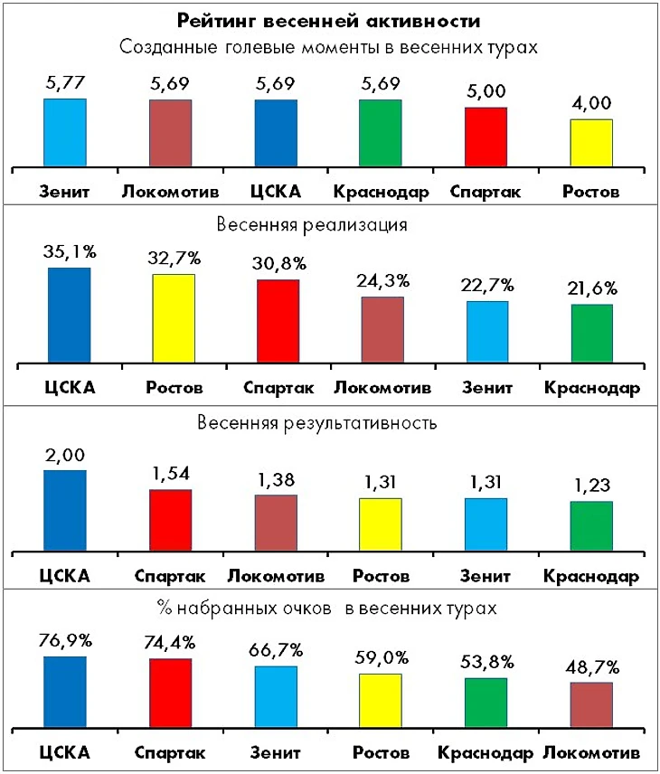 Армейцы традиционно сильно провели весну, обставив конкурентов практически по всем базовым атакующим показателям, а по отношению к осенним турам рост созидательной активности ЦСКА составил 33% (с 4,29 до 5,69 моментов за матч).