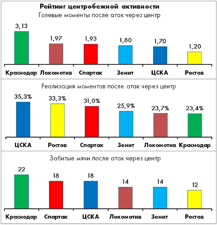 У «Зенита» из-за постоянной ротации центральных хавбеков этот вектор оказался и малоактивным, и неэффективным. Как следствие, продуктивность на центральном направлении по сравнению с прошлым сезоном упала почти вдвое (с 24 забитых мячей до 14).