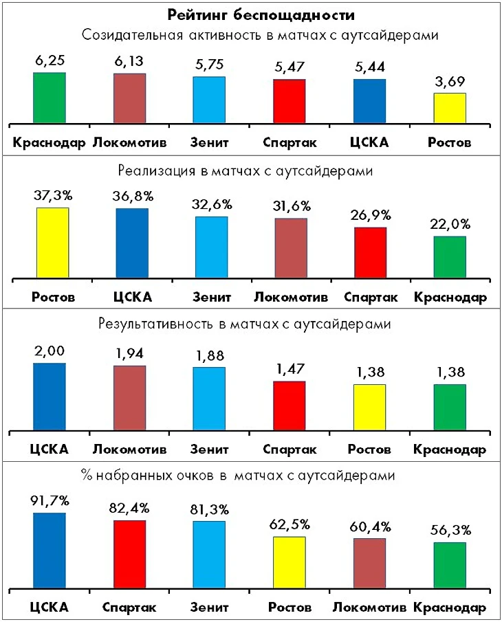 Самым милосердным по отношению к андердогам оказался «Краснодар», добродушно расписав с ними аж 9 ничьих в 16 матчах. «Быков» подводила кошмарная реализация моментов (с созиданием которых у них как раз особых проблем не было), вплоть до последней игры в Томске составлявшая менее 20%.