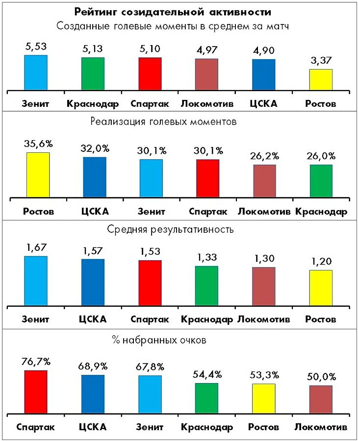 Основное преимущество перед конкурентами красно-белые создали за счет почти идеальной игры дома, где «Спартак» был по-хозяйски напорист, но временами излишне щедр (худшая эффективность при наибольшей активности).