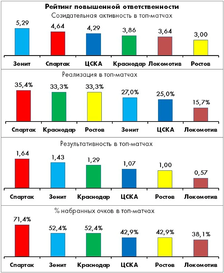 «Спартак» и «Зенит» замкнули «стандартный рейтинг», но если красно-белые 5 из 7 мячей забили в матчах повышенной сложности, то питерцы сделали это лишь раз, причём только в последнем туре. Этот гол Кокорина «Локомотиву», к слову, стал единственным победным для команды Луческу, забитым после розыгрыша стандарта, тогда как ЦСКА забил сразу 5 решающих голов после угловых и штрафных.