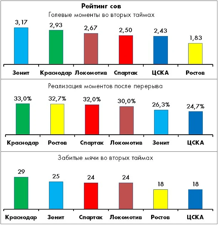Любопытно, что «жаворонки» в этом чемпионате выступили успешнее, чем «совы» - созидательная активность в первых таймах оказалась выше, чем во вторых только у «Спартака» (2,60 против 2,50) и ЦСКА (2,47 против 2,43).