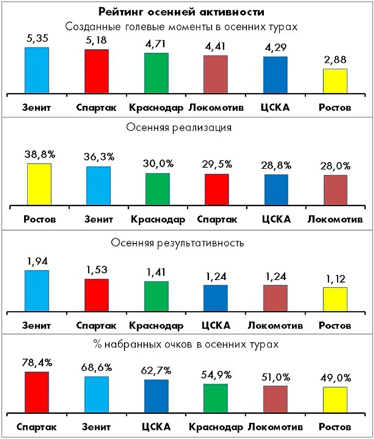 С реализацией по весне всё очень плохо было и у «Зенита» с «Краснодаром», хотя в первой части сезона обе команды по этому показателю уступали только «Ростову».