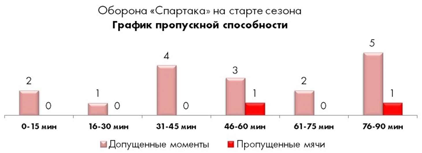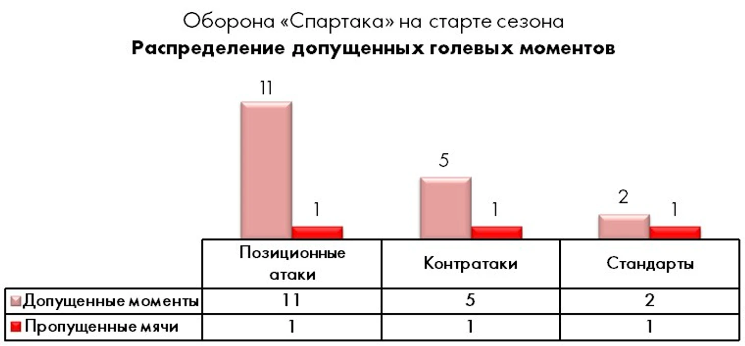 Если же просуммировать все допущенные голевые моменты у ворот «Спартака» в 4 сыгранных матчах, то картина вырисовывается следующая.