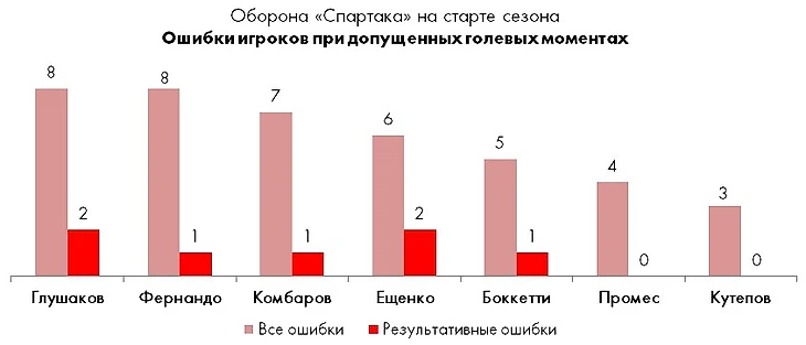 По общему количеству ошибок при потенциально голевых моментах соперника впереди всё те же Глушаков и Фернандо, но в пересчёте на игровое время Денис вне конкуренции. Ровно половина ошибок спартаковского капитана (4 из 8) имела чисто технический характер (невынужденные потери, брак при обработке мяча), тогда как бразилец в 6 из 8 случаев ошибался позиционно или при подстраховке.