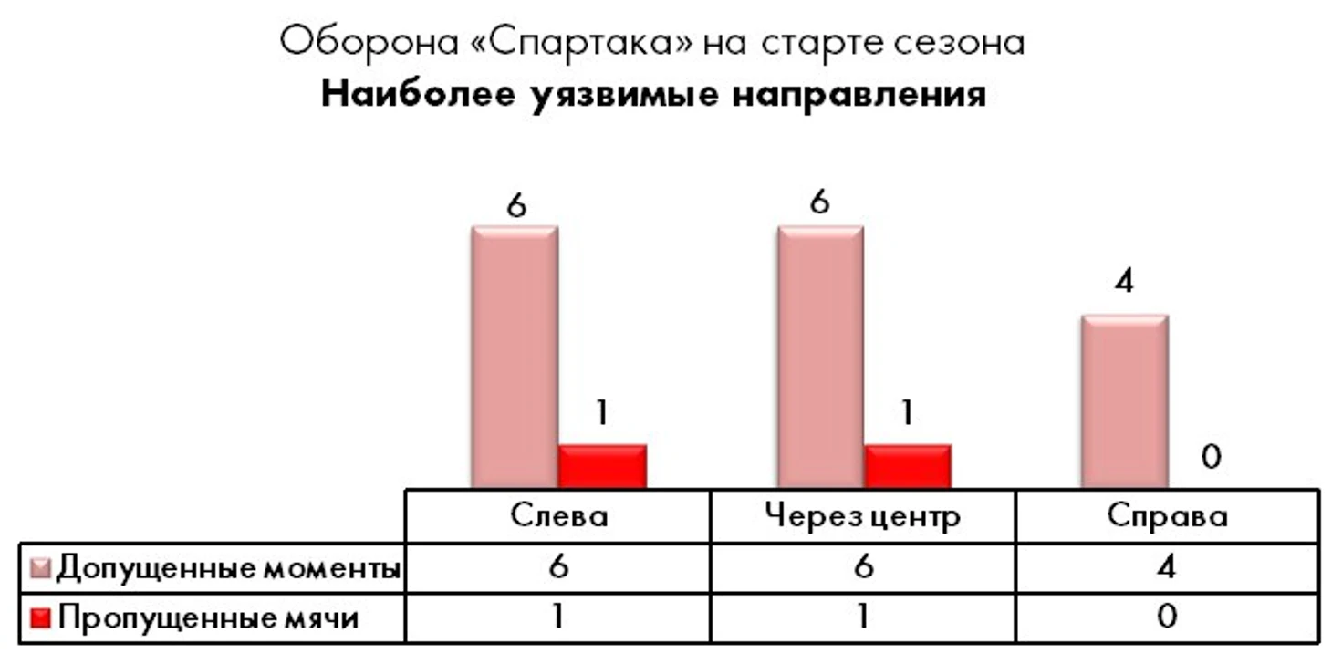 В векторном отношении чуть более надежно вроде бы выглядит правый фланг спартаковской обороны, но здесь необходимо сделать важную поправку. Дело в том, что отвечающий за это направление Ещенко допускал ошибки в 4 из 6 эпизодах с допущенными моментами после атак соперника через центр.