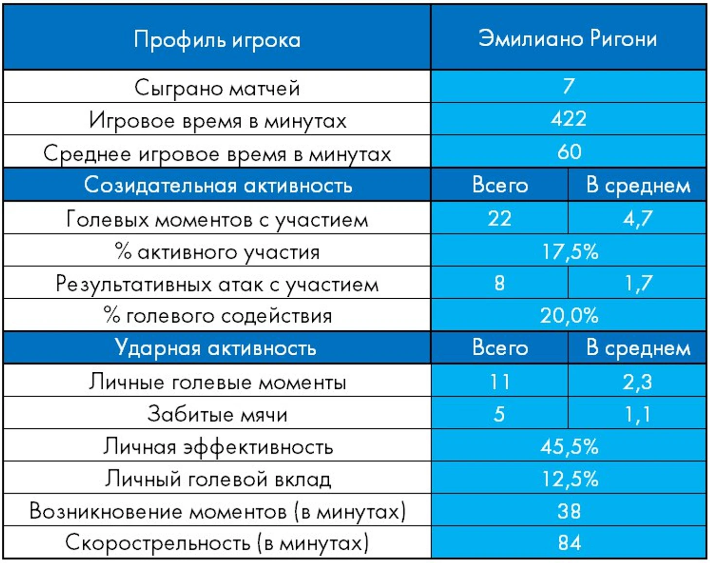 Текущая статистика Ригони, который последним из аргентинцев оказался в «Зените», вообще поражает воображение. Проведя на поле 422 минуты, он 22 раза отмечался в голевых моментах (11+11 по личным моментам и передачам), а его относительный уровень активности составляет 4,7 полезных атакующих действия в среднем за полный матч.