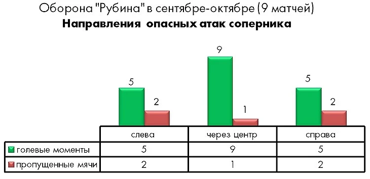 Серьёзные проблемы в центральной зоне у казанцев возникли только в матче со «Спартаком» (5 допущенных моментов – 1 гол), так что в векторном отношении наибольшей голевой перспективой обладают фланговые атаки. Отчасти это связано с тем, что «Рубин» - худшая команда лиги по блокированию кроссов, и в матче первого круга «Зенит» этим дважды воспользовался.