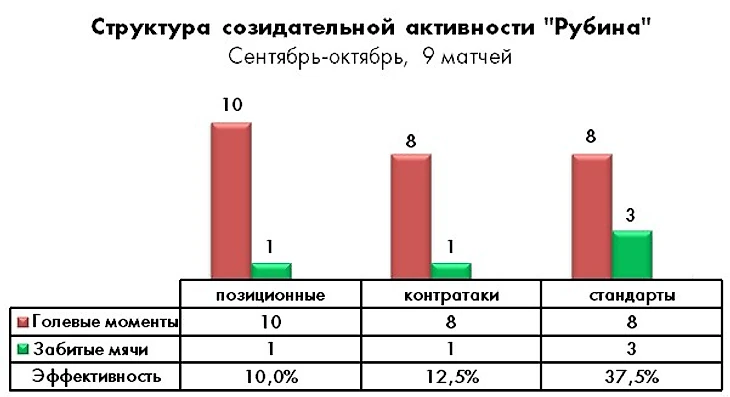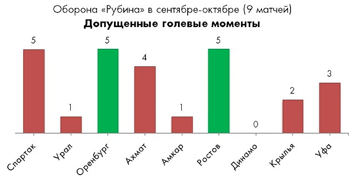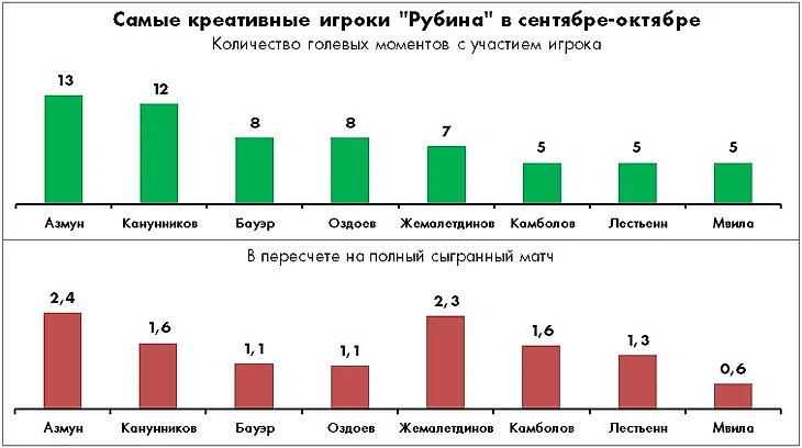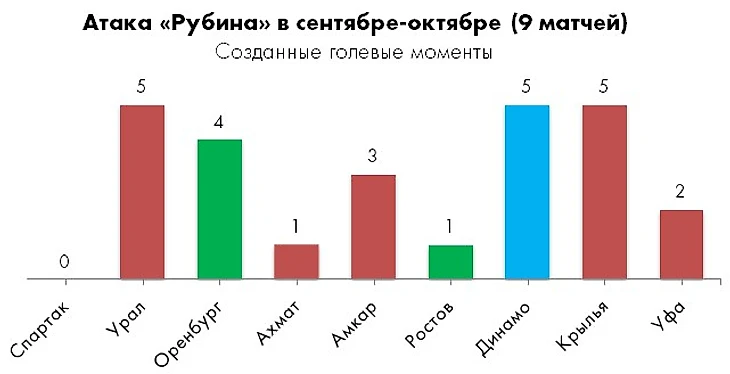 Этой осенью «Рубин» не только почти не забивает (5 мячей в 9 матчах), но и демонстрирует удручающую созидательную динамику, которая подтверждается и общедоступной статистикой (по количеству ударов и удачных попыток дриблинга – 13-й показатель в лиге; по точности передач – 14-й; по проценту владения – 12-й).