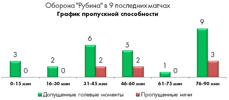 Аккурат на концовки таймов приходятся 60% потенциально голевых угроз у ворот «Рубина» (15 из 25 допущенных моментов) и 5 из 7 пропущенных мячей на осеннем отрезке. В этом контексте опять-таки можно вспомнить июльский матч в Питере, где победный гол Себастьяна Дриусси был забит уже в добавленное время.