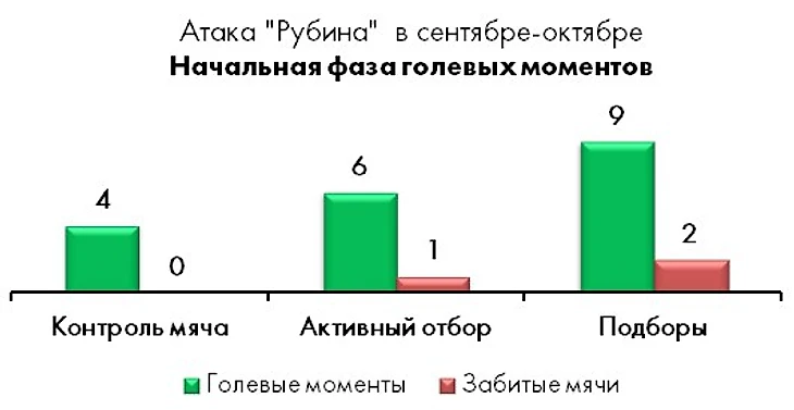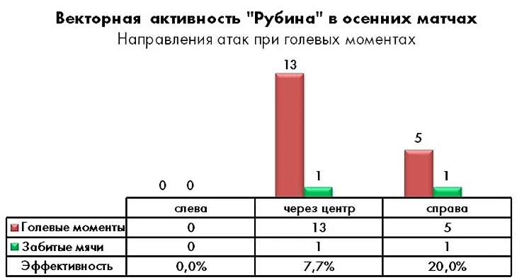 Создавать моменты в игровых ситуациях у «Рубина» пока получается плохо, и это в равной степени касается как скоростных атак, так и позиционных. Дефицит креативной мысли усложняется еще и ужасающей реализацией (18 моментов/2 гола – 11%), что для того же бердыевского «Ростова» было абсолютно не свойственно.