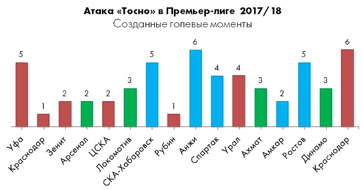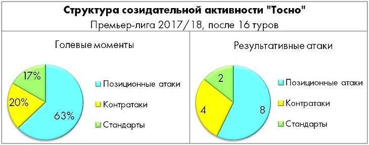 В отличие от «Ростова» прошлогоднего образца, контратаки не являются сильной стороной команды Парфенова (хотя со второй половины первого круга тосненцы намного лучше стали атаковать на скорости), а вот в позиционном нападении «Тосно» действует куда продуктивнее (в среднем 2 голевых момента за матч против 1,2 у дончан в сезоне 2016/17).