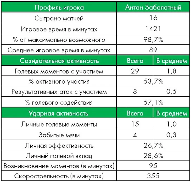 Заболотный – явный лидер команды по общему количеству полезных атакующих действий при голевых моментах (29), хотя в относительном выражении (с поправкой на разницу в игровом времени) его напарник Марков выглядит ничуть не хуже. При этом в плане личной эффективности Евгений вообще имеет преимущество (8 моментов/5 голов у Маркова; 15 моментов/4 гола у Заболотного).