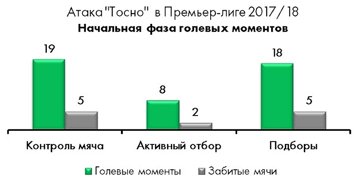 Активный прессинг нельзя назвать фирменной чертой «Тосно» (непосредственно после отборов и перехватов – лишь 2 гола из 14), в то время как нацеленность на подборы нейтральных мячей с последующим обострением явно присутствует (что и логично для команды, которая заточена на лонгболлы). Чаще других ключевые единоборства в начальной фазе атак с голевыми моментами выигрывали Чернов (4), Заболотный и Дугалич (по 3 у обоих).